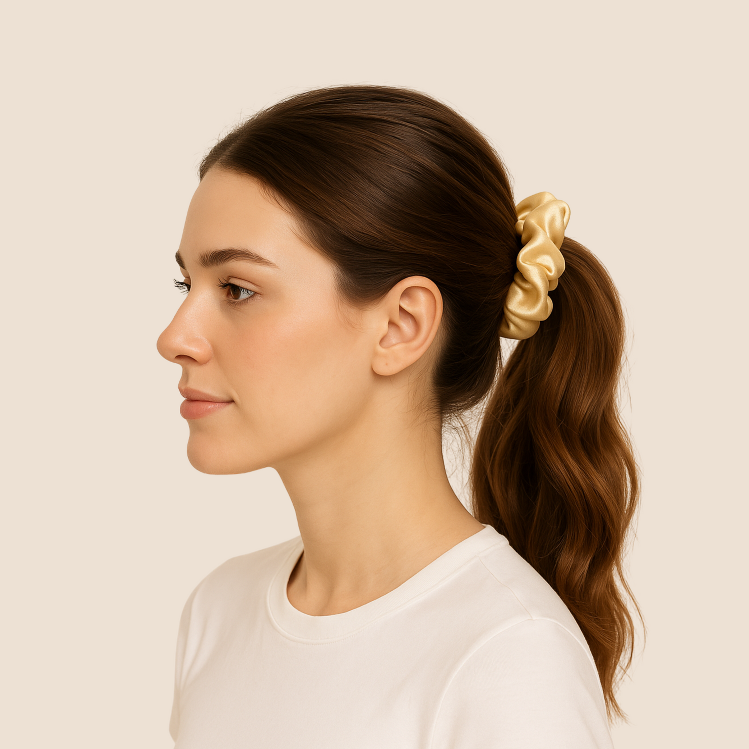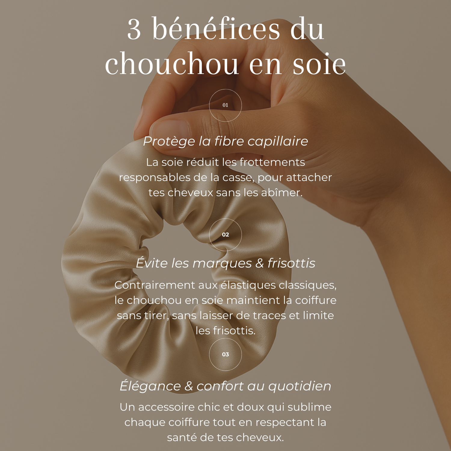Utilisez le chouchou en soie pour attacher vos cheveux sans les casser. Élégant, il accompagne vos looks quotidiens.