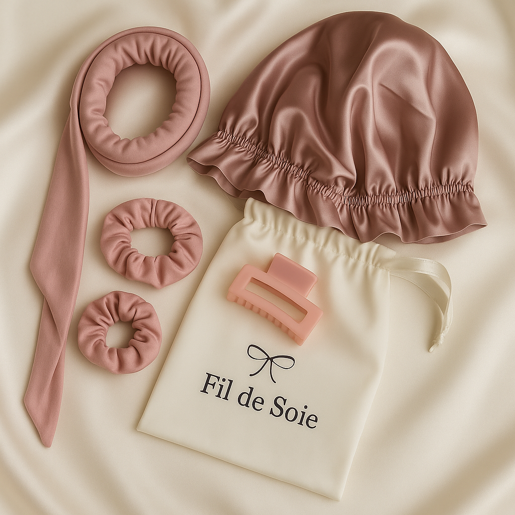 Avec FILDESOIE™, chaque bonnet et chaque chouchou devient un véritable soin capillaire nocturne. La soie de mûrier protège, hydrate et discipline vos cheveux pendant que vous dormez — pour des matins plus simples, sans compromis sur la beauté.